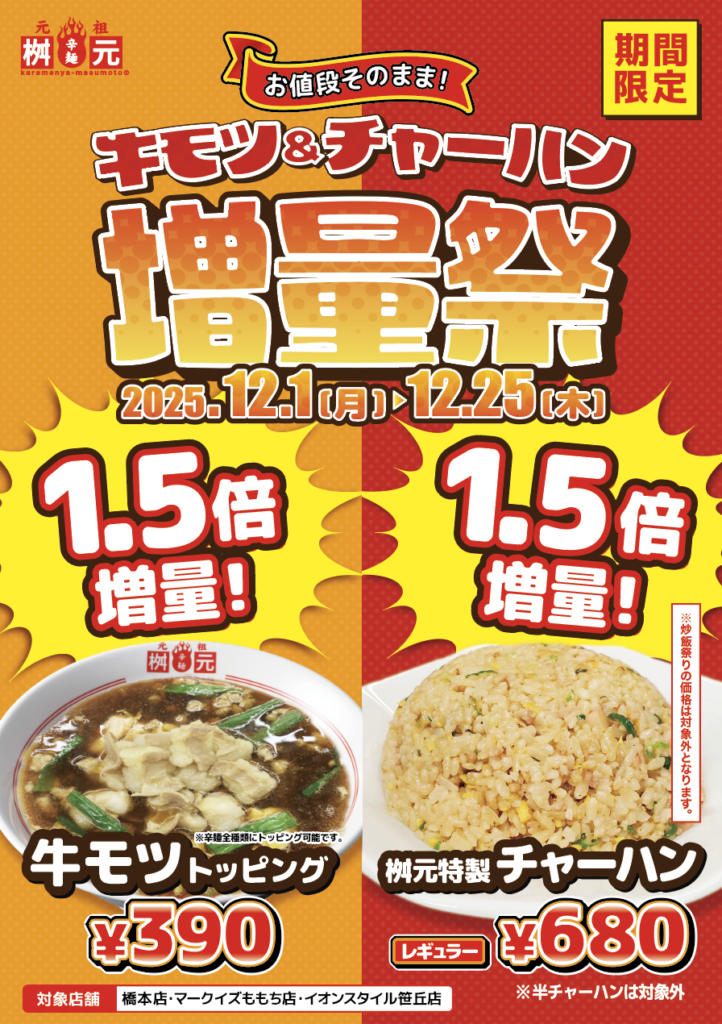 福岡県の橋本店、イオンスタイル笹丘店、マークイズ福岡ももち店では、12月1日〜12月25日までの期間中、牛モツトッピングとチャーハンの増量祭を開催します!